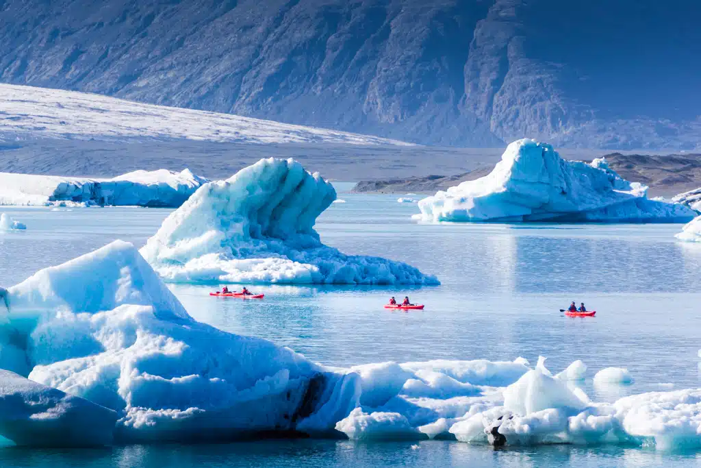 Dernière manière pour découvrir le site de Jökulsárlón : prenez part à une excursion en kayak. Sans aucun bruit de moteur pour briser la quiétude des lieux, vous pourrez pagayer sur l’immense lagune, bercé par le craquement du glacier et le ballet des icebergs. Nous n’avons jamais eu l’occasion de tester cette activité à Jökulsárlón mais nous opterons très certainement pour cette excursion lors de notre prochain voyage !