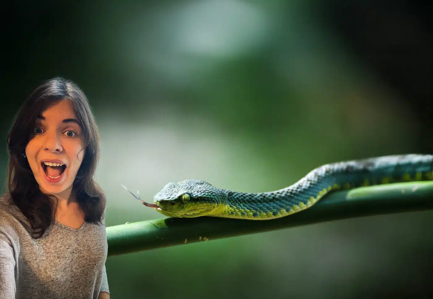 Je sens quelque chose me piquer le doigt ! Je retire instinctivement ma main, je lève la tête, et je vois… Un énorme serpent vert qui s’est redressé et qui me regarde droit dans les yeux en dodelinant de la tête.